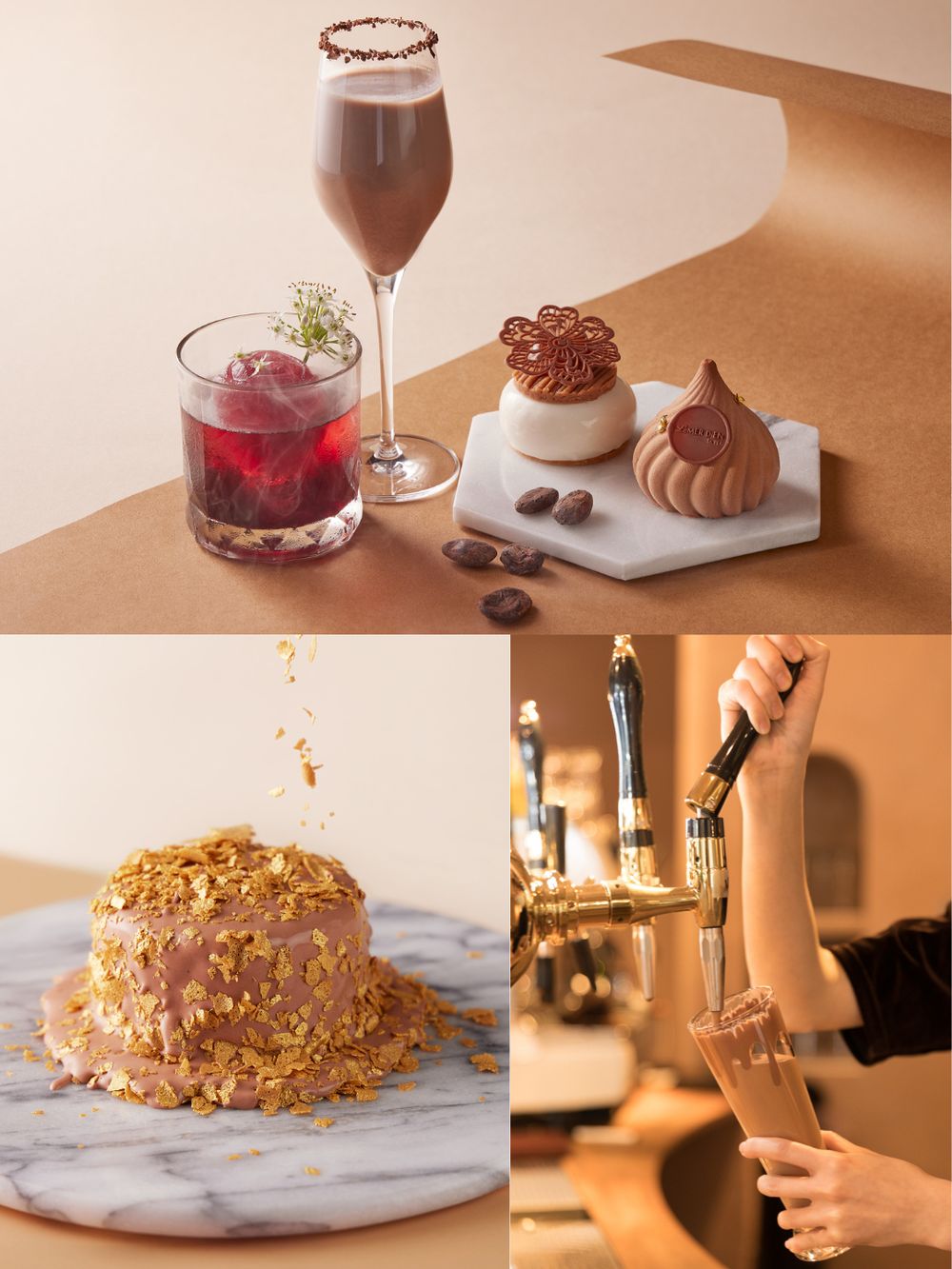 以巧克力來療癒寒冷的冬季,融化在嘴中的甜蜜黑時尚現在在台北寒舍艾美酒店就吃得到!攜手知名巧克力專門店「TERRA土然」,自10月20日至12月20日推出「Bean to Bars」多款聯名巧克力甜品,「從產區到吧檯」將不同區域的可可豆帶入北緯二十五,幻化成不同風貌的巧克力甜品,包含四款全新蛋糕以及兩款飲品「氮氣冰巧克力」與「可艾女人」莓果風味可可氣泡飲。另外雙人套餐「可可協奏曲」現正優惠中,內用每組只要$880元就能吃到視覺系的「可可金脆雪崩蛋糕」搭配可可飲品兩杯,巧克力控快帶上閨蜜一同午茶去!