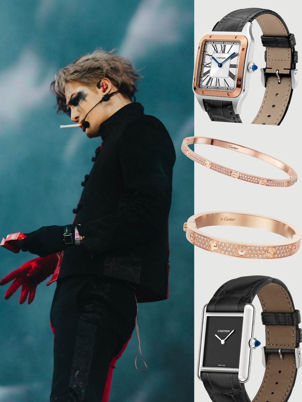 除了本次Coachella舞台給足滿滿視覺震撼(用劍刺穿身體&與女舞者貼身熱舞!),向來衣著品味非凡的王嘉爾也在服裝上下足功夫。此番王嘉爾雖然沒有大曬招牌冰塊腹肌,但手上的腕錶卻成造型Level Up關鍵。身為Cartier品牌摯友的他,直接把自己當成行走的招牌,黑色手套襯出低調奢華的TANK MUST DE CARTIER腕錶,黑色真漆錶盤與側邊鑲嵌的凸圓形合成尖晶石形成鮮明對比,同色系半啞光鱷魚皮錶帶雋永素雅,彰顯鮮明個性,難怪王嘉爾愛不釋手。