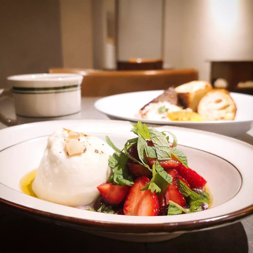 雖說是開胃菜,但份量也沒有在客氣。一大球的布拉塔起司帶著溫和的奶香,淋上橄欖油,再配上香甜的新鮮草莓🍓與糖漬草莓,醬香與乳香交融,一口吃下倍感療癒。而這之中還加入了紫蘇葉,讓整體的味道更加輕盈,我很喜歡。