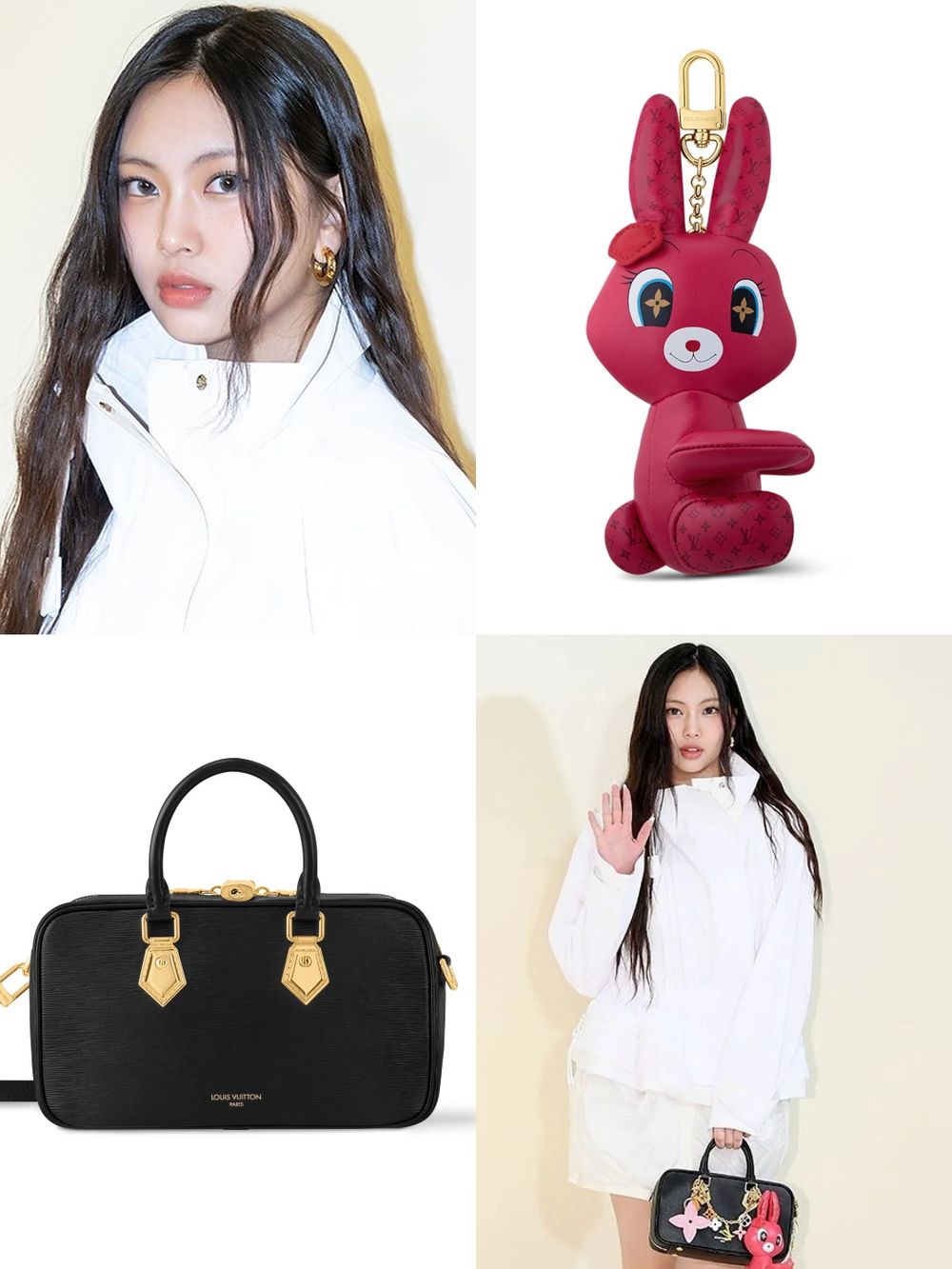 身為年輕世代代表的她,身上的配件也充滿小心機,手上提的最新黑色手提包,上頭點綴了LV各種包包吊飾,打造出最流行的Y2K風格,而包包上的吊飾也成為了另類的討論焦點,由其實包包上的小兔子掛飾也讓粉絲們笑說:好像Hyein本人唷!而這些精緻的LV包包吊飾可說是價格不斐呢~算算光包包吊飾就價值台幣九萬多,可說是包包掛飾界的天花板了!快一起來看看Hyein著用的同款包包和吊飾有哪些吧!