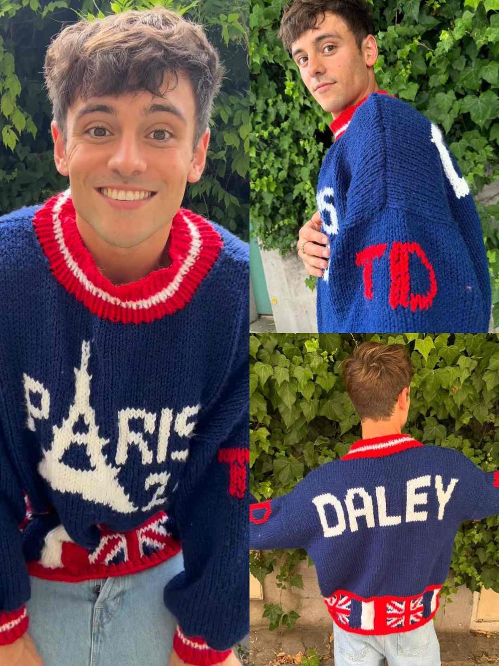其實早在七月時,Tom Daley就在自己的毛衣品牌「Made With Love By Tom Daley」官方IG發佈過設計的手稿,這次的毛衣他以英國國旗的藍、紅、白作為主要色系,並且在毛衣的正面織上「Paris、24、巴黎鐵塔」等奧運相關元素,背面則是以自己的名字「Daley」做點綴。