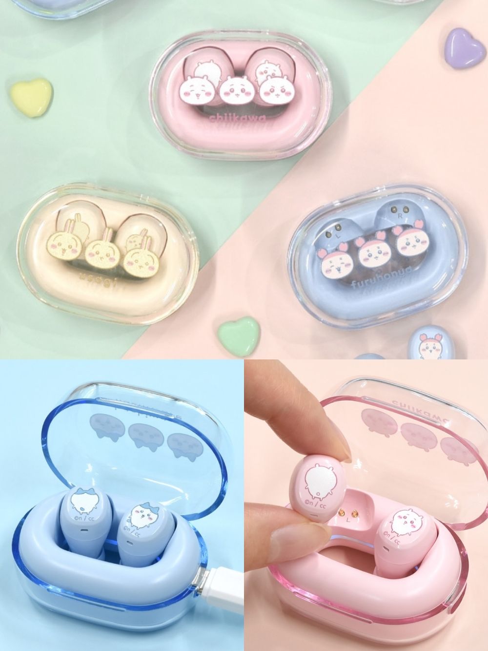 像是吉伊的款式就是採用粉色、小八是藍色、烏薩奇是黃色,而小桃和古本屋則分別是白色與淺藍色,蓋起充電盒的時候還可以看見三種不同表情的大頭圖案,真是太卡哇伊啦!